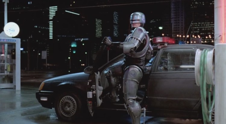 A lot of violence of various sorts, particularly in a derelict steel mill (apparently the Kaiser Steel Mill in Fontana). Both before and after the death of the policemen. Discussions in the board room of the corporation and in the laboratory where Robocop is developed. Impressive moments as he deals with the bad guys. Just a bit of nudity in the police changing room – which in this future puts boys and girls together.