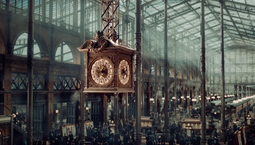 Content: There is no sex or nudity, but routine smoking and drinking in Paris. Mostly Hugo scampers about behind the walls of the station repairing and winding the clocks. We see the huge wheels and sprockets doing their stuff (must have been impressive in 3D]. Minor plots play out between station employees and passengers. The filmmaker George Méliès is discovered and his work shown, inspiring Hugo’s final escape from the station inspector which involves him hanging from a clock hand.
