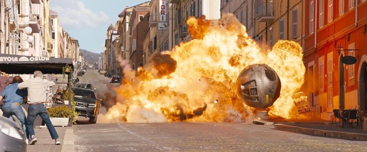 Content: There is no sex or nudity although the film returns briefly to the street racing environment which always involves young woman in short shorts and halter tops. There is a scene in the garden of Dom’s suburban house with everyone sitting about drinking beer and eating. Once we start on the set pieces Reyes is usually seen operating some sort of radio control device and Dom driving grimly in his supercar. The bomb in Rome is a ball rolling down the streets, only stopped when Dom’s car leaps into the air to swing a crane round. Jacob and Dom’s son escape is a small aircraft at one point. Letty fights her way out of jail. In London the team go to Shaw for help, but don’t actually seem to do anything. Dom drives along grimly a lot.