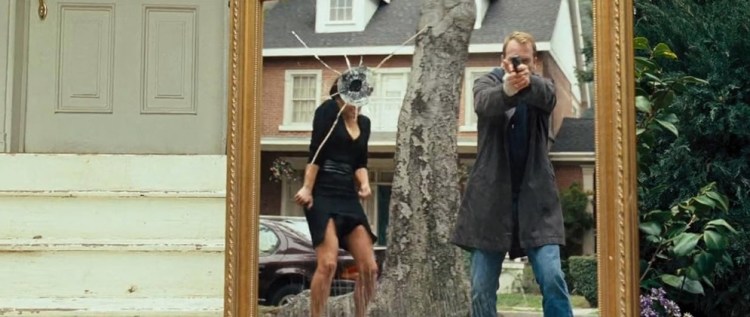 Plot of Mirrors: Ben Carson is a policeman, suspended for something, and has taken a job as a security guard in a former department store, destroyed by fire. He is estranged from his wife and living with his sister. Things are happening in the mirrors in the building, but he can’t tell what and when he tells people about it they think he is suffering from PTS. He receives a package from the previous security guard with info about the mirrors, and we have seen the guard apparently kill himself. We see Ben’s sister die gruesomely at the hand, it seems, of her mirror reflection, so Ben goes to the family home and starts to remove mirrors to his wife’s distress. He is prompted by the name Esseker, appearing on one of the store’s mirrors to search out for anyone with that name, and a distressing story emerges, centring on a child Anna Esseker who was imprisoned in a mirrored room in the store’s basement. Can Ben find Esseker and set the demons to rest.