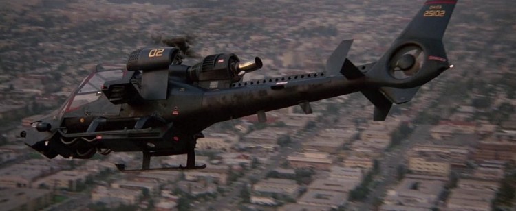 Plot of Blue Thunder: Frank Murphy is a police helicopter pilot who had flashbacks to his time in Vietnam. With his navigator, Lymangood, they are distracted by a woman doing naked calisthenics, and so miss a robbery to which they were assigned. Murphy is grounded, but nevertheless is taken by his boss to see a military style helicopter, Blue Thunder, doing its stuff, piloted by Colonel F.E. Cochrane an enemy of Murphy’s from Vietnam. On learning that Murphy is scheduled to fly Blue Thunder he sabotages Murphy’s current aircraft, but both he and Lymangood survive the resulting crash. Then out in Blue Thunder the pair record a conversation involving Cochrane which seems to be directed at the assassination of those who might prevent the helicopter from being purchased by crime prevention organisations. Lymangood is killed in a hit and run. Murphy steals Blue Thunder and directs his girlfriend Kate to a dumpster where the tape of the conversation is hidden. She finds it and drives off to get to the TV news, Murphy takes on the police cars, F-16s and Cochrane in an armed aircraft.